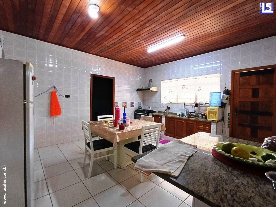 Casa principal: 4 Quartos sendo 3 Suítes, 2 Salas, Cozinha, Área de serviço, Banheiro, Espaço gourmet, Piscina, Vestiários, Quiosque com churrasqueira, e Garagem.