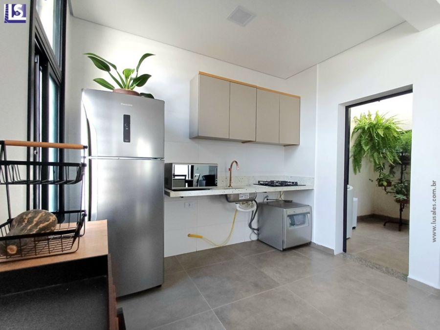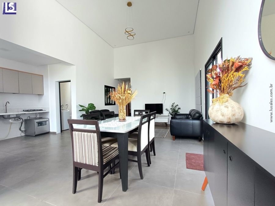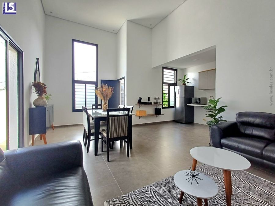 Sala com pé direito alto, Cozinha em conceito aberto, 2 Quartos sendo 1 Suíte, Área de serviço, Espaço gourmet e Garagem para 2 veículos com portão eletrônico.